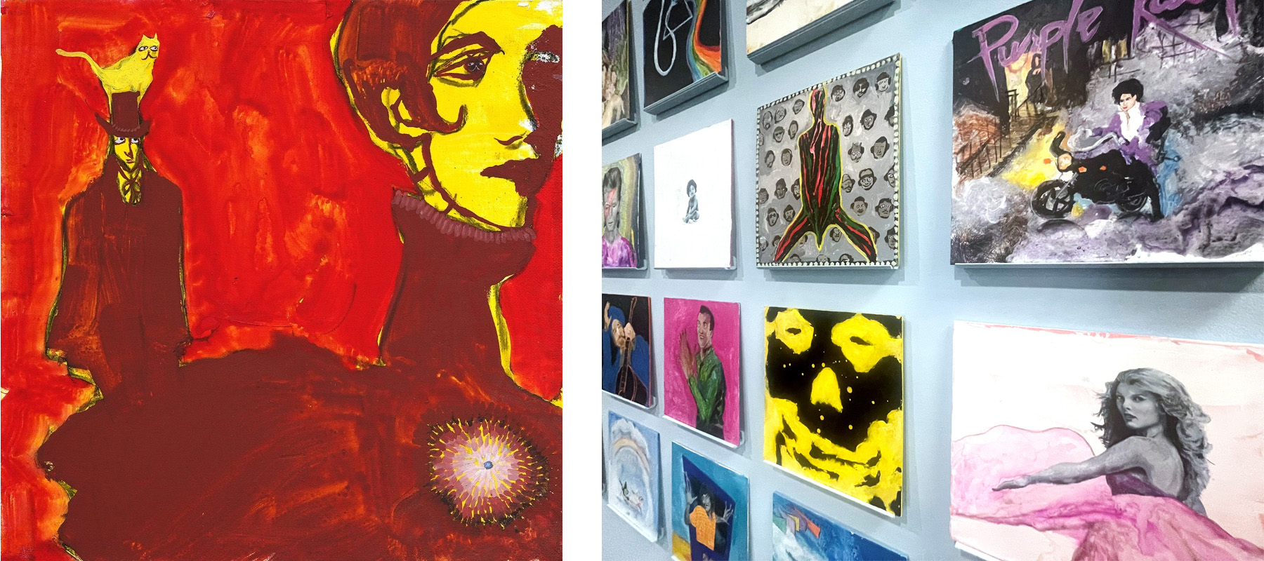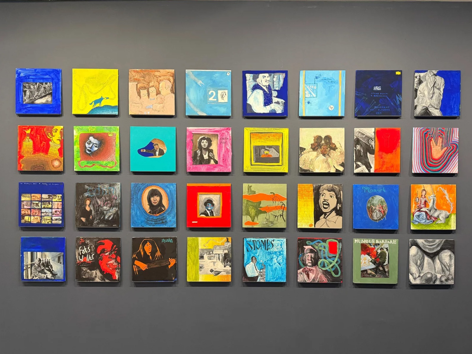 “In my studio, I approach this question through painterly means: thick daubs of acrylic paint, realist gouache, gestural charcoal mark-making, and sometimes absurd flourishes like strange figurative cats or eerily smooth monochromes. I treat each album as a visual puzzle—one that lets me explore the limits and freedoms of style. Over time, certain patterns in my work emerge—not only stylistic signatures, but emotional rhythms. The act of analog reproduction becomes a method of self-discovery. Even when painting someone else’s image, my voice comes through in the ways I alter, simplify, exaggerate, or reinvent visual language.”